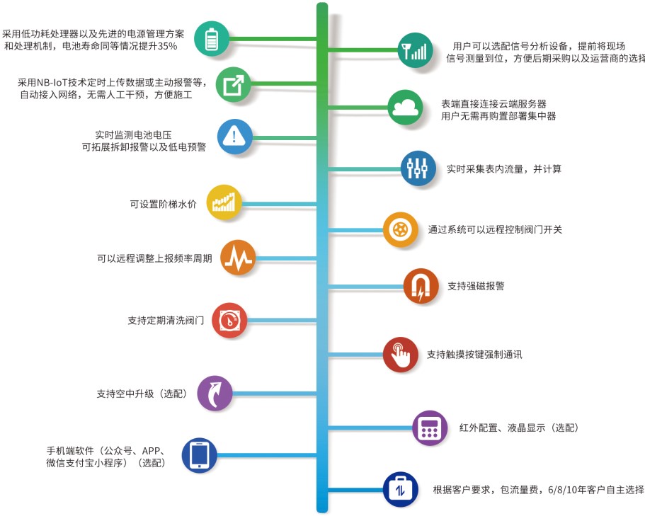 巨靈物聯網水表整合了新一代的物聯網通訊技術、儀表傳感器技術、計算機軟件匯總分析,具有數據采集、存儲、通訊、儀表閥門控制、遠程監測控制等功能